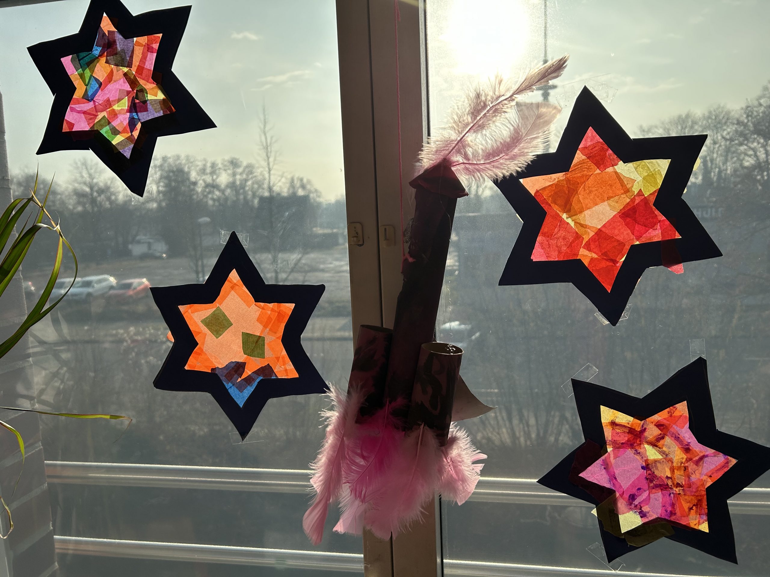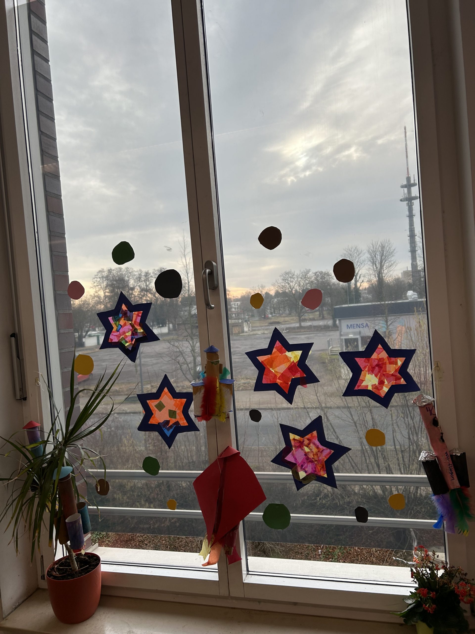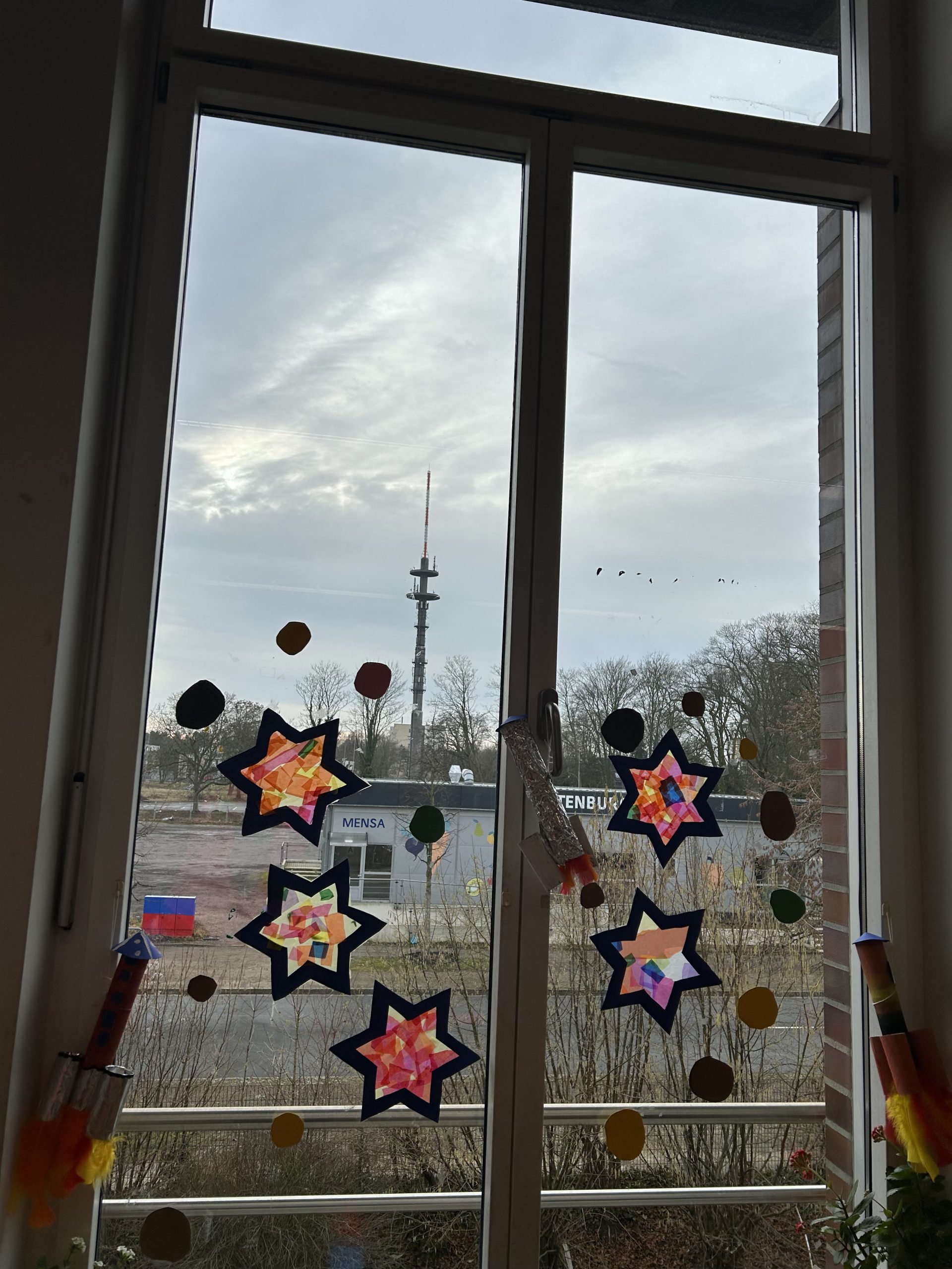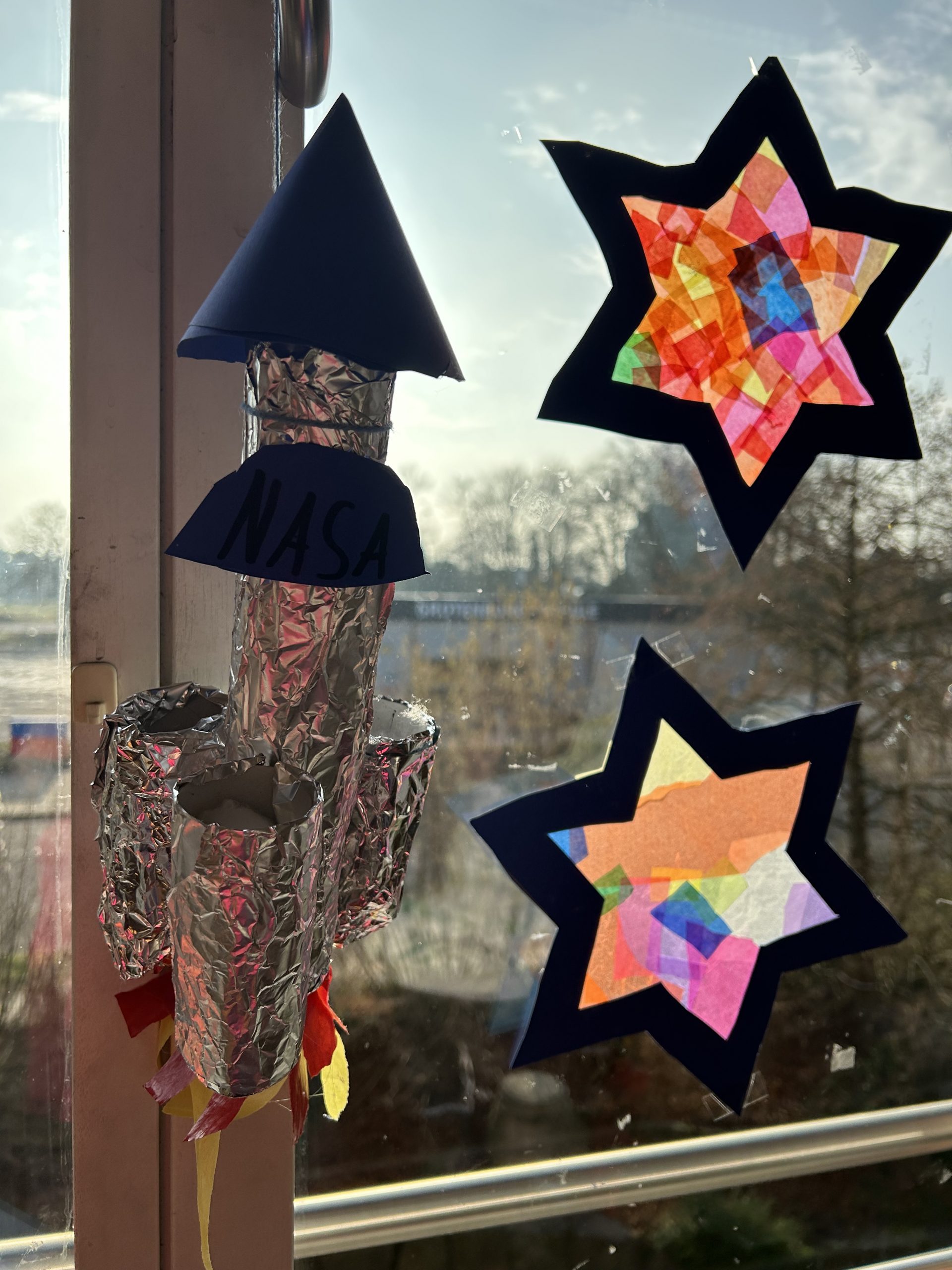 In der Schule wurden die Klassenräume passend zum Thema dekoriert. Mit Liebe zum Detail wurden phantasievolle Raketen gebastelt und schmücken jetzt die Fenster der Klasse 4c.
